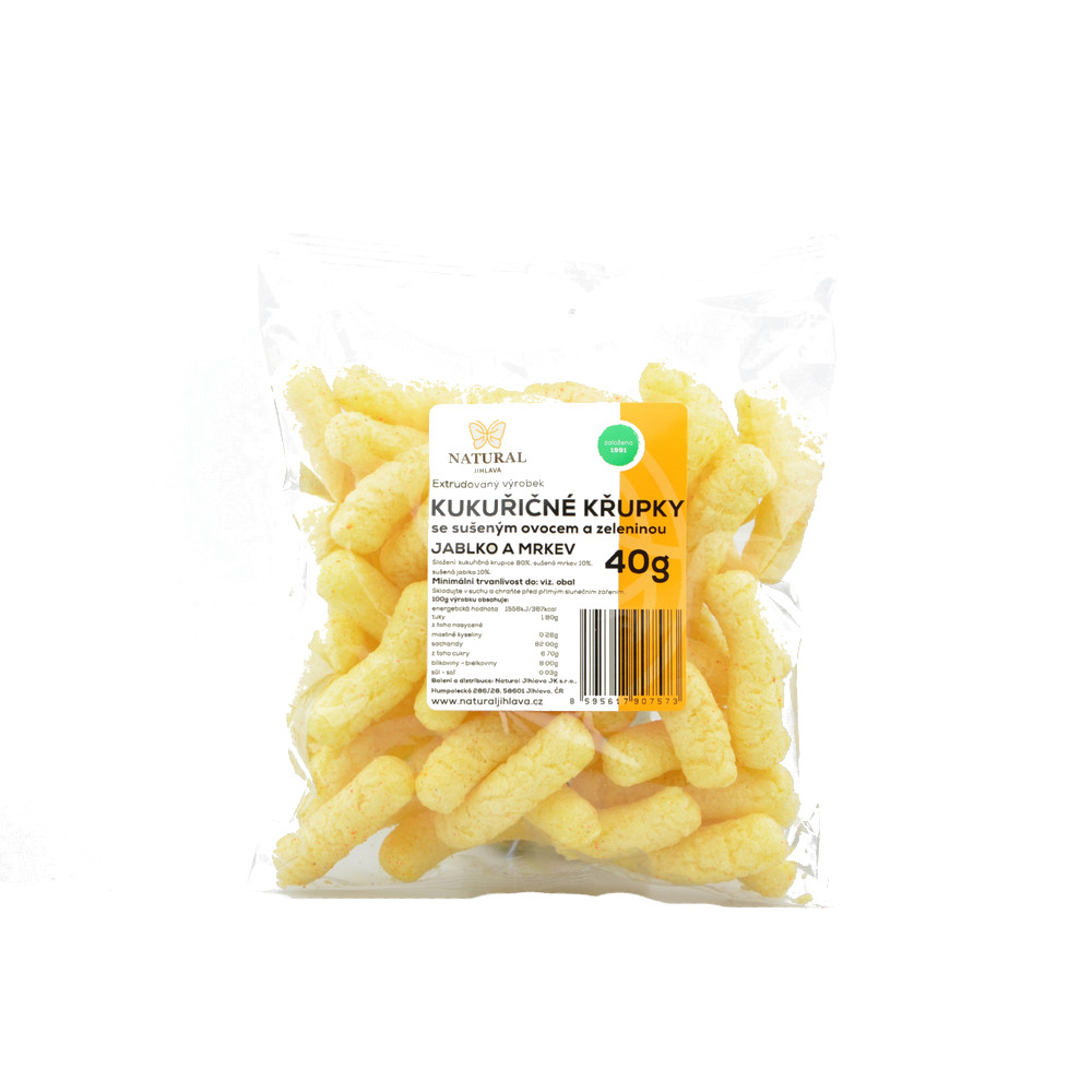 Složení: Kukuřičná krupice 80%, sušená mrkev 10%, sušená jablka 10%.